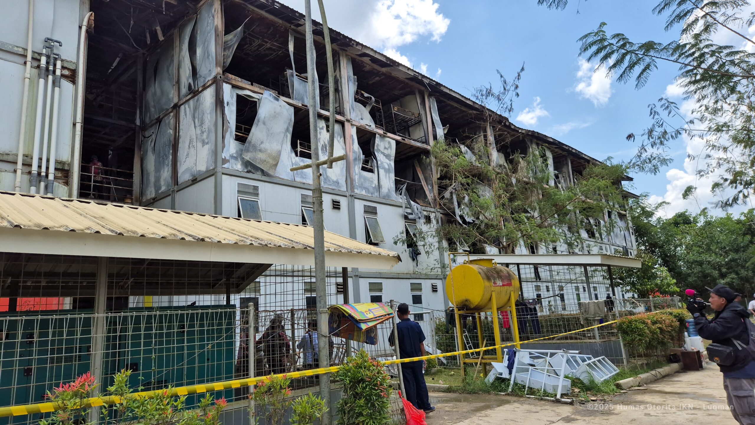 Area sekitar kamar turut terdampak oleh panas dan air pemadaman. Data kerugian material masih dihitung OIKN bersama pengelola gedung.